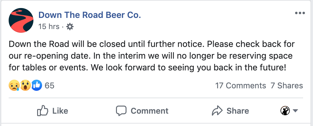 Late Friday night, Down the Road Beer Company announced it will be “closed until further notice,” but the closure is expected to be temporary.
